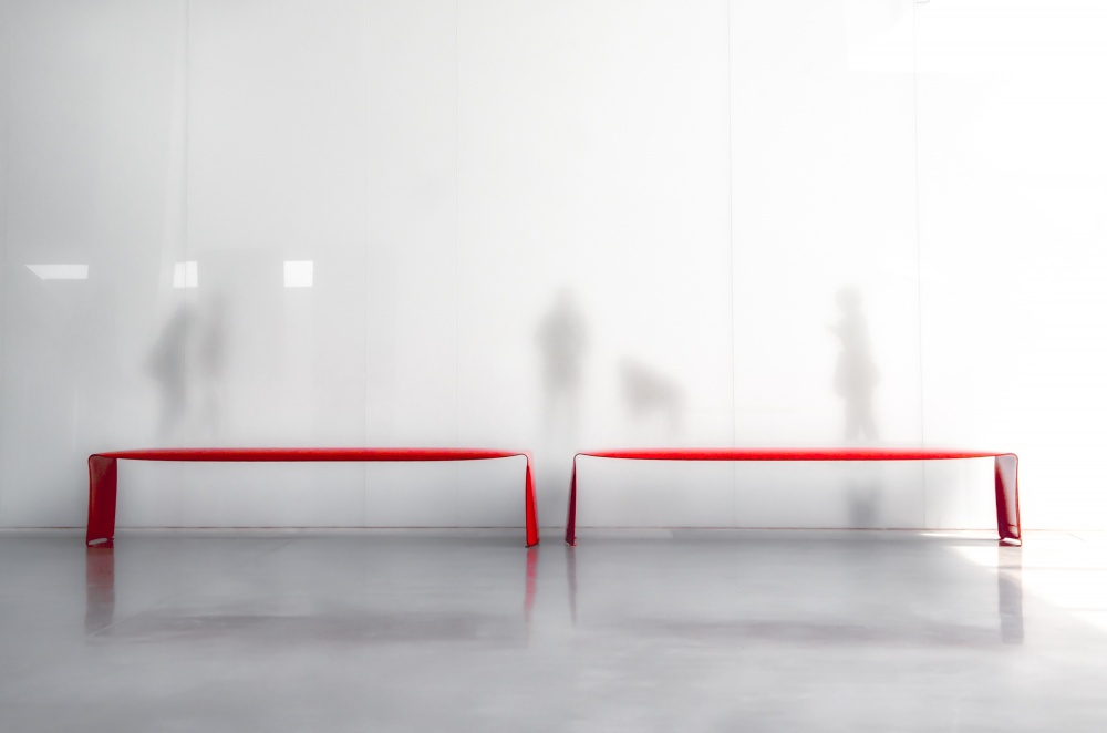 I first positioned myself in the middle of the reflection, but because I needed to shoot from a lower angle, I asked my husband to stand exactly between the two benches. I'm the one crouched down next to him. The light was perfect. I saw the reflection of the three bright squares on the left, and on the right a bright reflection on the floor created good balance. I wanted more people in the picture, so after some trial and error (and patiently waiting for a few passersby to fill the empty, white spaces) I was satisfied. I had to stay there for quite some time until I found the right composition, but all worked out very well in the end.