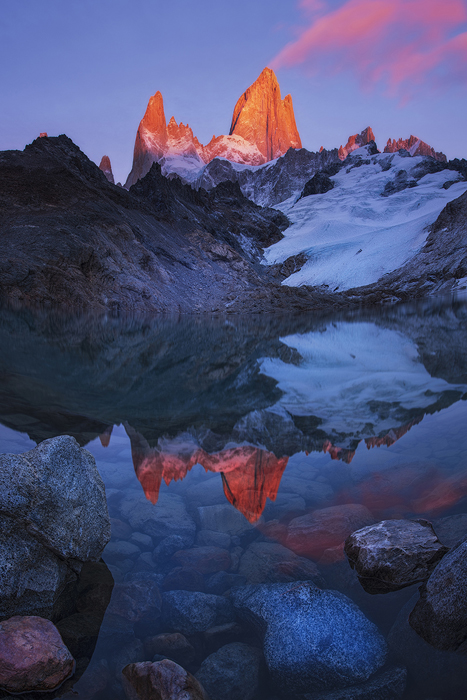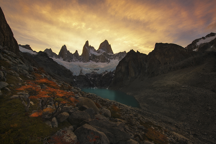 For each of my backpacking trips, I usually stayed 2-3 nights in the mountains, and then went down to El Chalten to get supplies and refreshment. Once I identified a potential shooting location, I patiently waited for the right time to take my shots. Sometimes, I was based at a camp-site and from there I would go to a more remote mountain area and spend a night there to take my photographs.