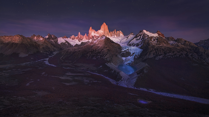 When the camera completed the last exposure, I browsed through the shots in a backward order. In the last few shots, I noticed the Fitz Roy peaks glowing brightly in the dark. I lifted my head up to the sky and saw the peaks still translucent in the night.  At the same time, the moon was rising behind me – this was an amazing natural phenomenon caused by moonlight.
