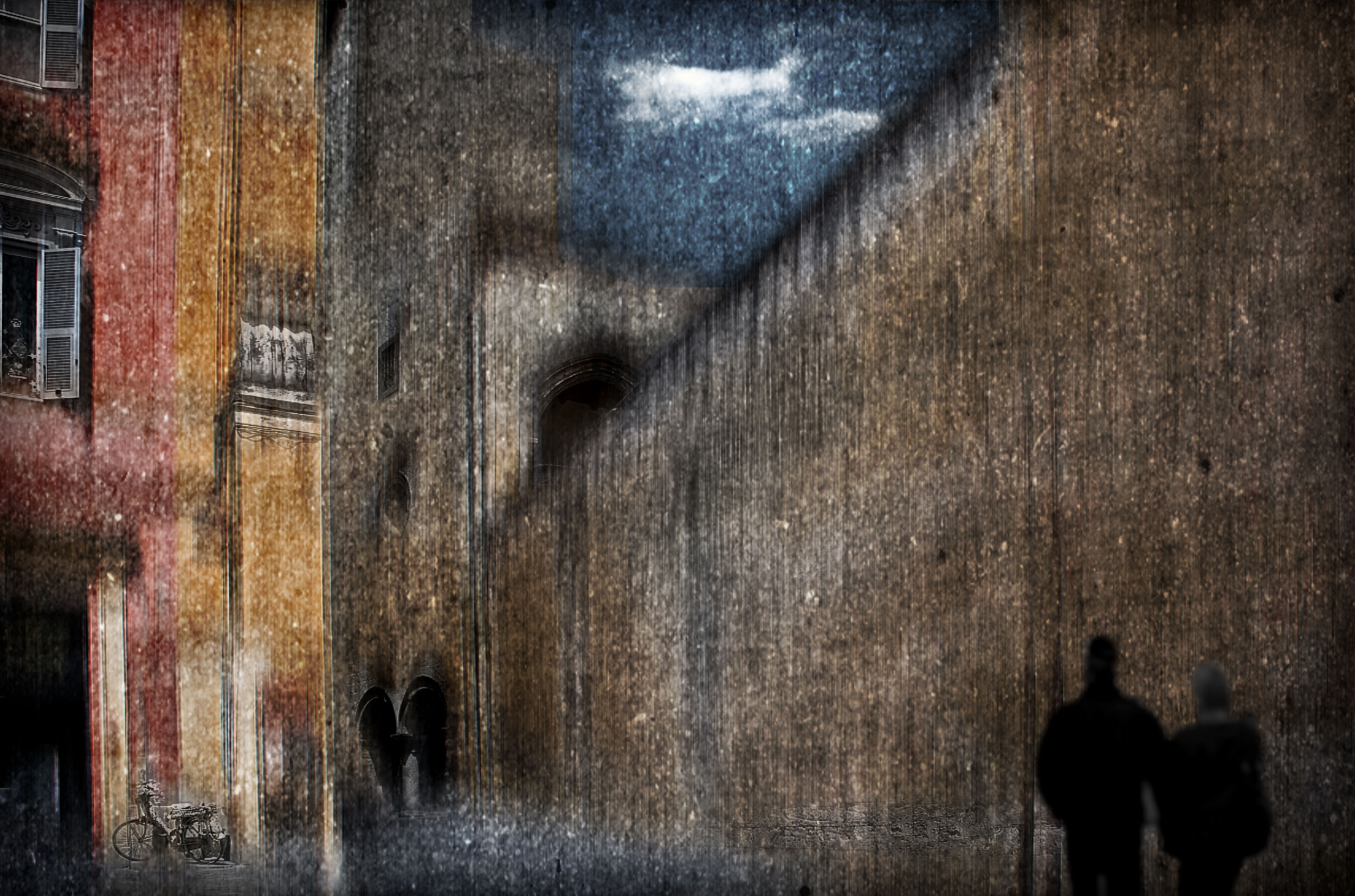 I also can insert external elements, such as people or objects. This operation often creates surreal results that I love very much. Finally, depending on the type of subject, I can insert scratches or dirty filters between one level and another to give the resulting drama and material consistency.